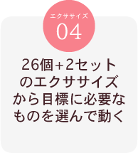 目標に合わせて体が必要だと感じる分だけ(1個で十分と思う方はそれでもOKです!)エクササイズを行います。