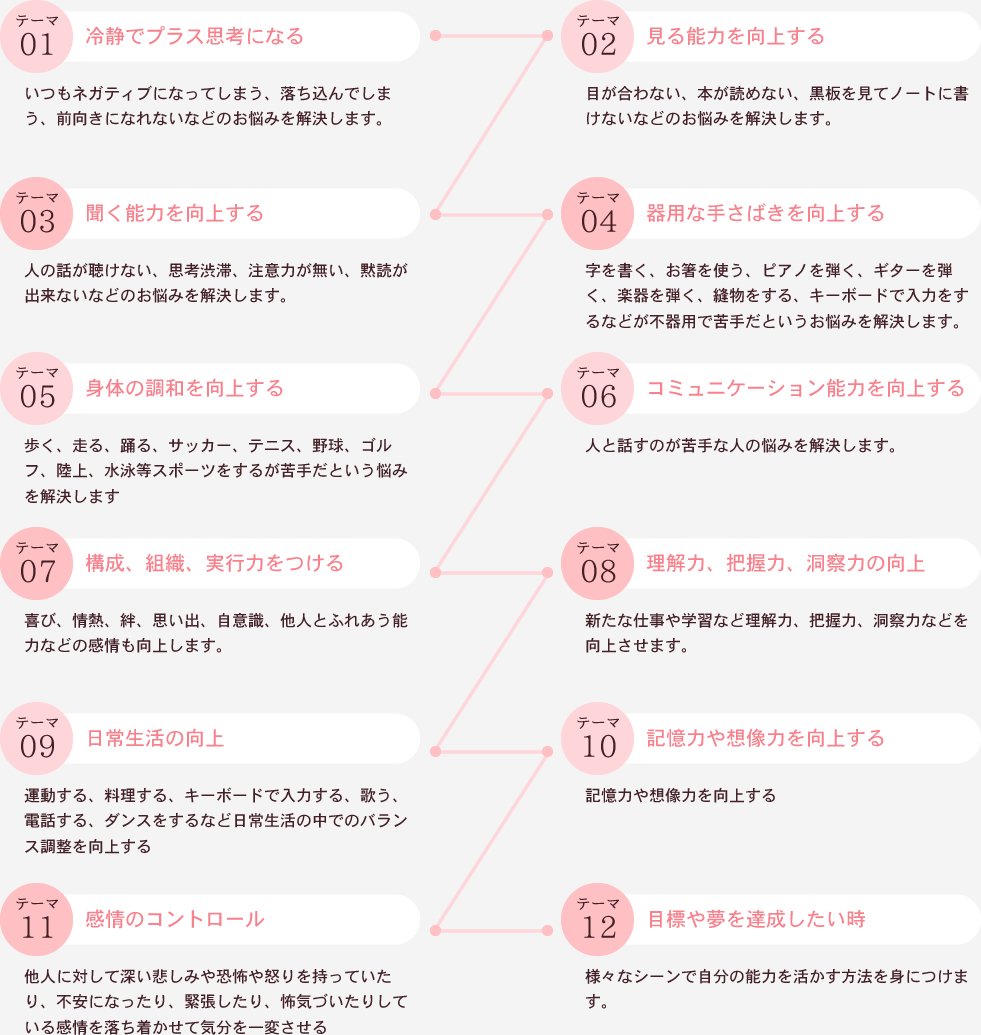 講座終了後は上記のブレインジムメニューのセッションを全て自分で行えるようになります。