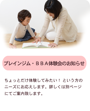 BBAとはBuilding Block Activity(ビルディング ブロック アクティビティ)の略です。BBAはブレインジム170の中からセシリア・ケスター教育学修士により特別に支援が必要な人の為に考案された発達の土台になるものだけを集めたものです。長年、公立学校と私立学校の特別教育の教師をし、誰もが可能だと思わなかった子ども達の行動やふるまいに良好な変化を起こし、希望を与えてきました。